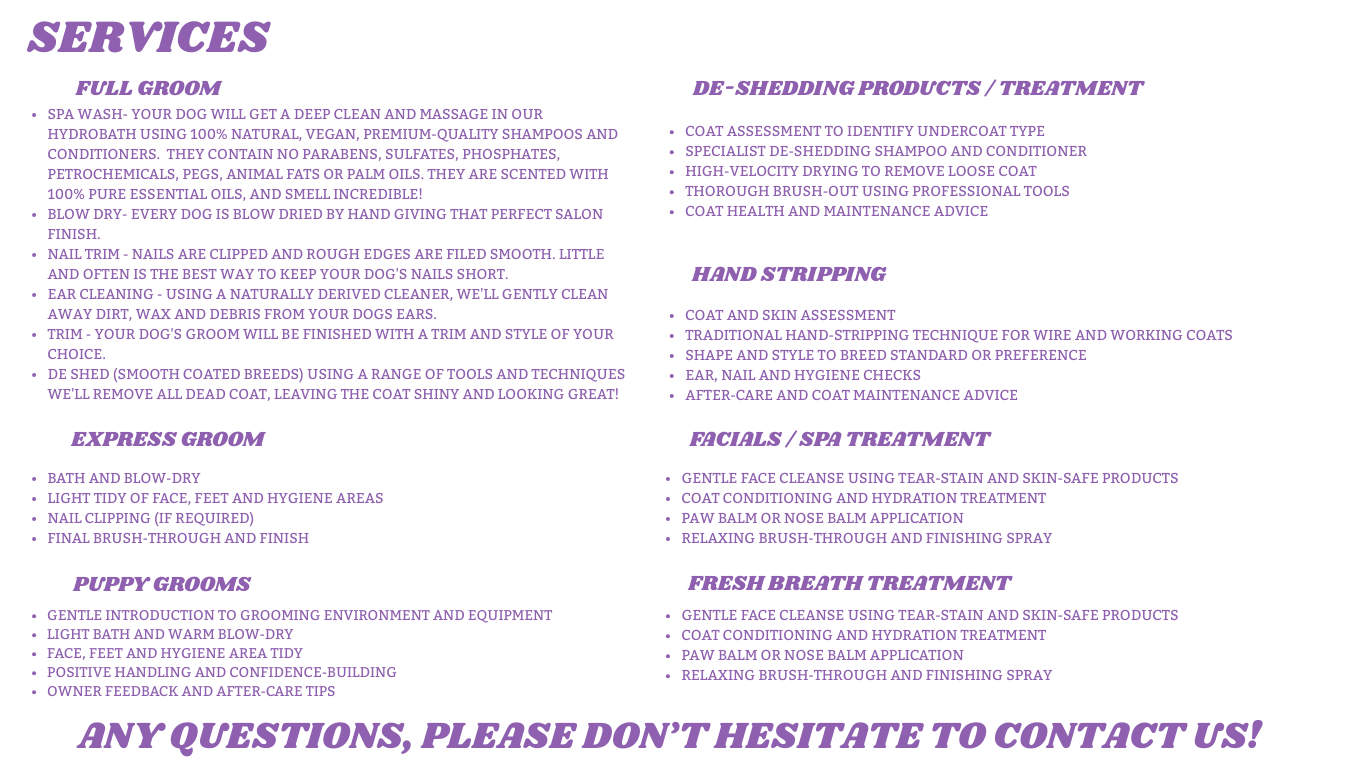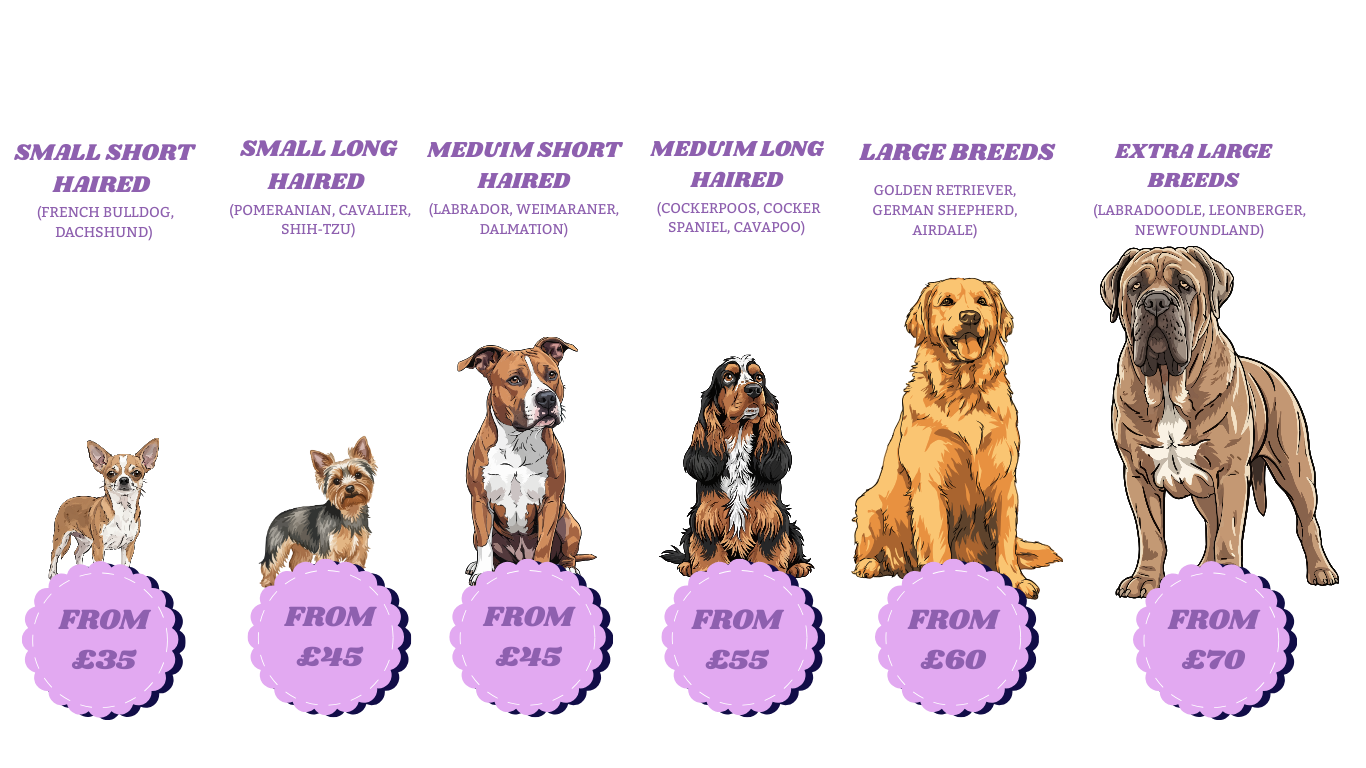 Our pricing is shown as a guide to help you understand the typical cost of our grooming services. Every dog is unique, and factors such as breed, coat condition, size, temperament and the service required can influence the final price.